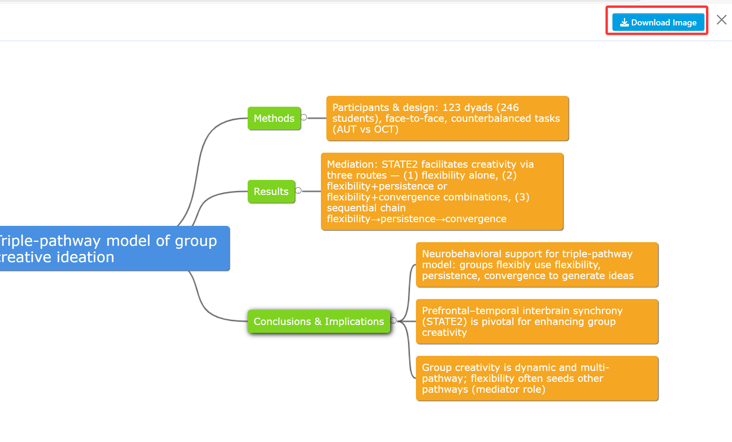 When you want the mind map, just click the Mind Map icon in the top right corner. ChatPaper will extract the structure of the paper—background, research questions, methods, key findings, and conclusions—and turn it into a clean, compact mind map.