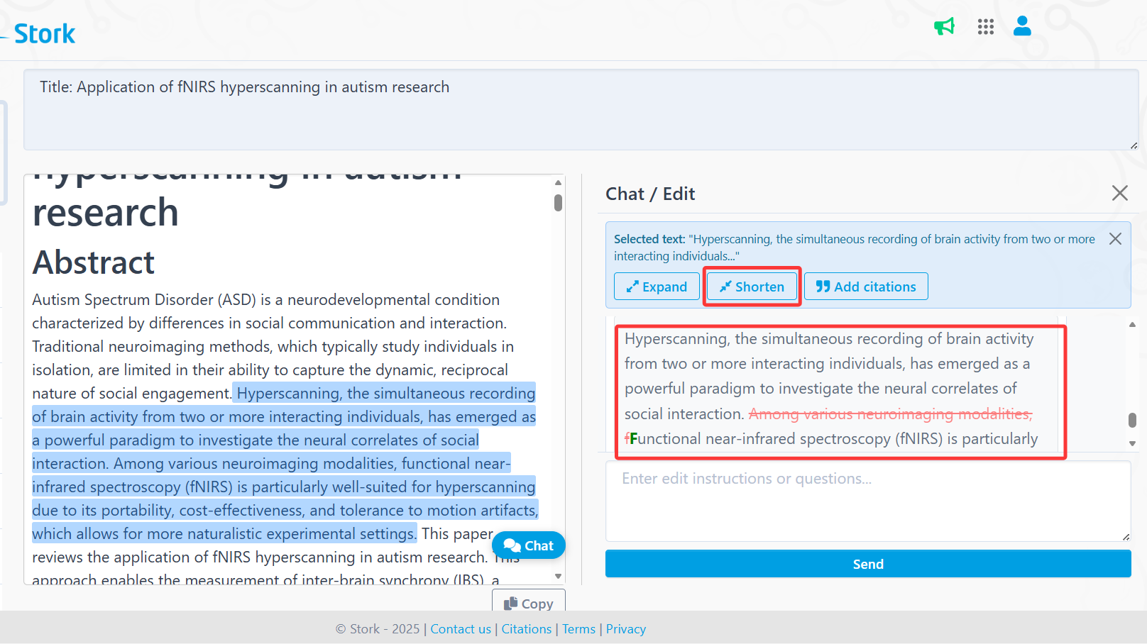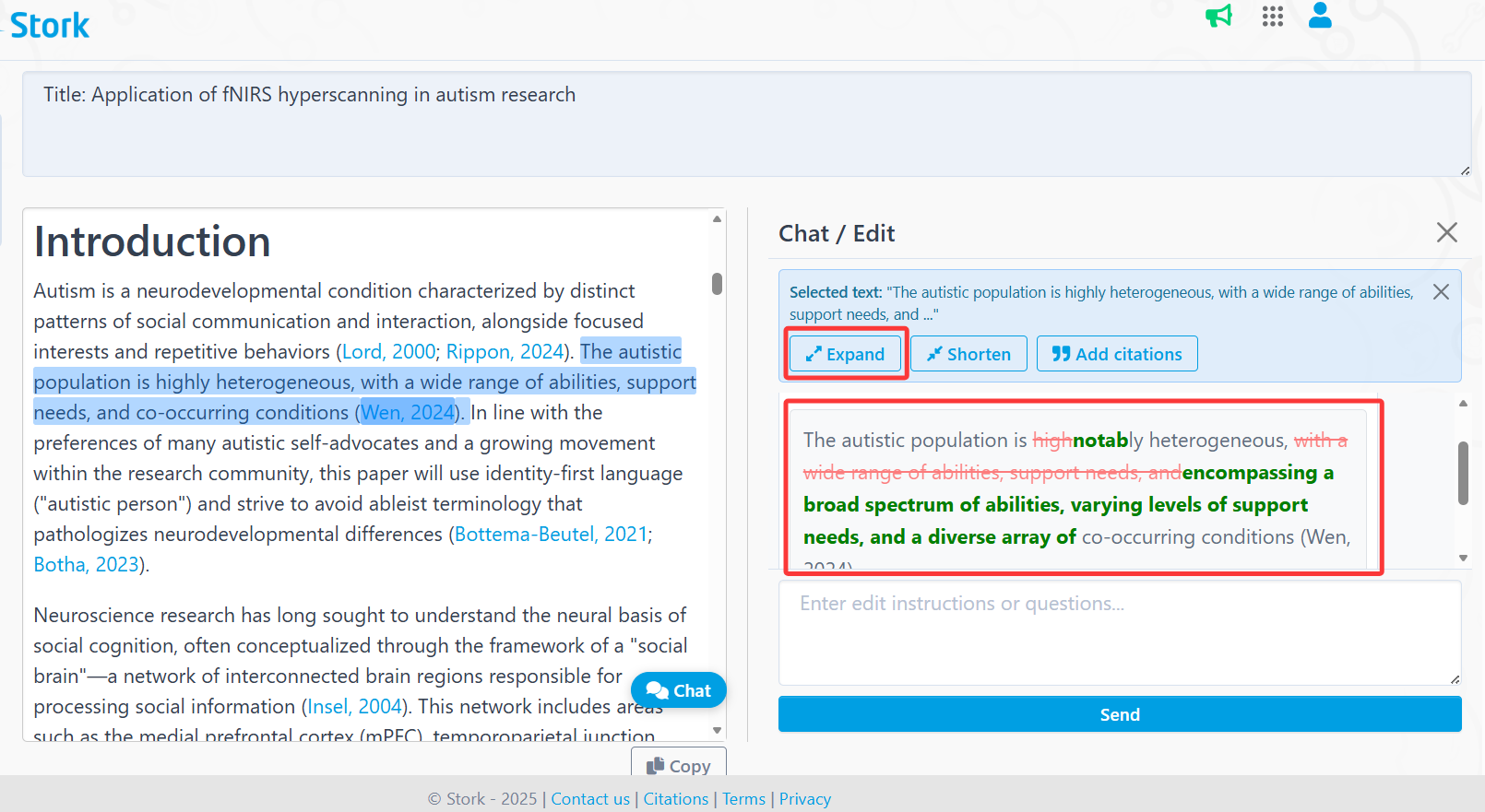 You can then select any sentence or paragraph and apply quick edits such as [Expand], [Shorten], or [Add Citations]. If you’re satisfied with the revision, you can replace the original text directly.