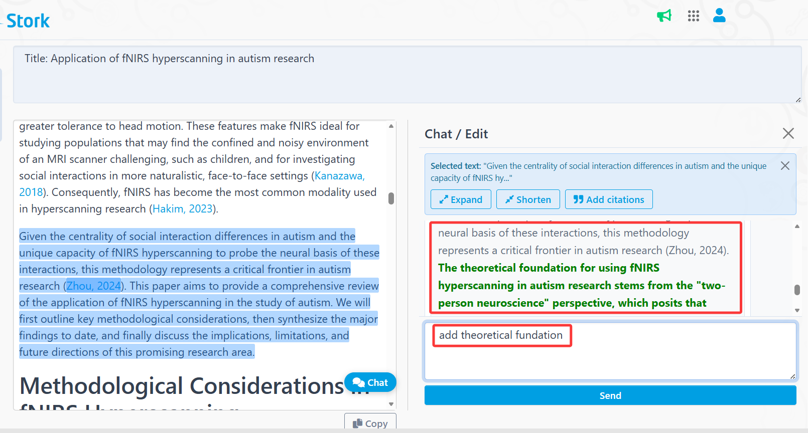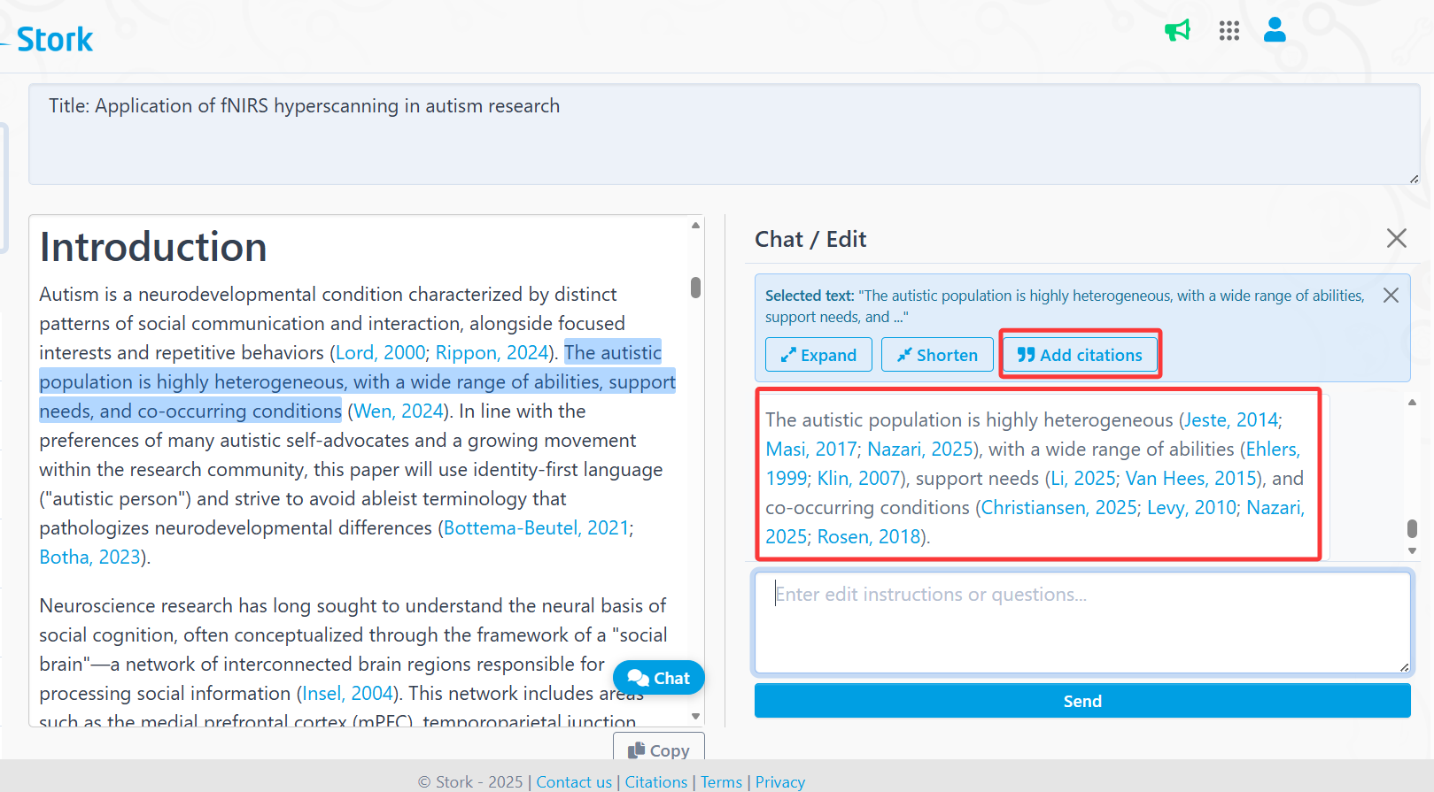 [Add Citations] helps identify relevant references for the selected content, similar to Stork’s advanced feature TrueCite.