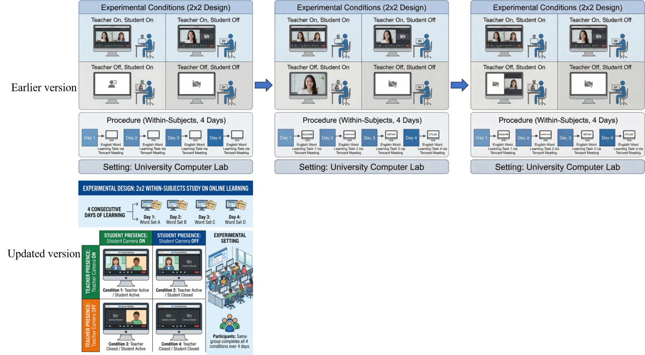 For example, imagine you want to draw a 2 (Teacher presence: camera on vs. camera off) × 2 (Student presence: camera on vs. camera off) experimental design.