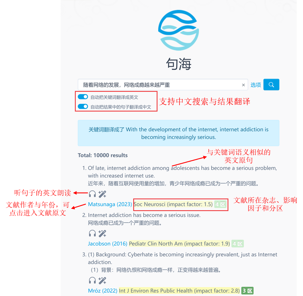 这样一来,我们不仅能找到和自己想表达的意思高度契合、但语义更丰富的文献原句,还能优先看到来自高质量期刊的表达方式。