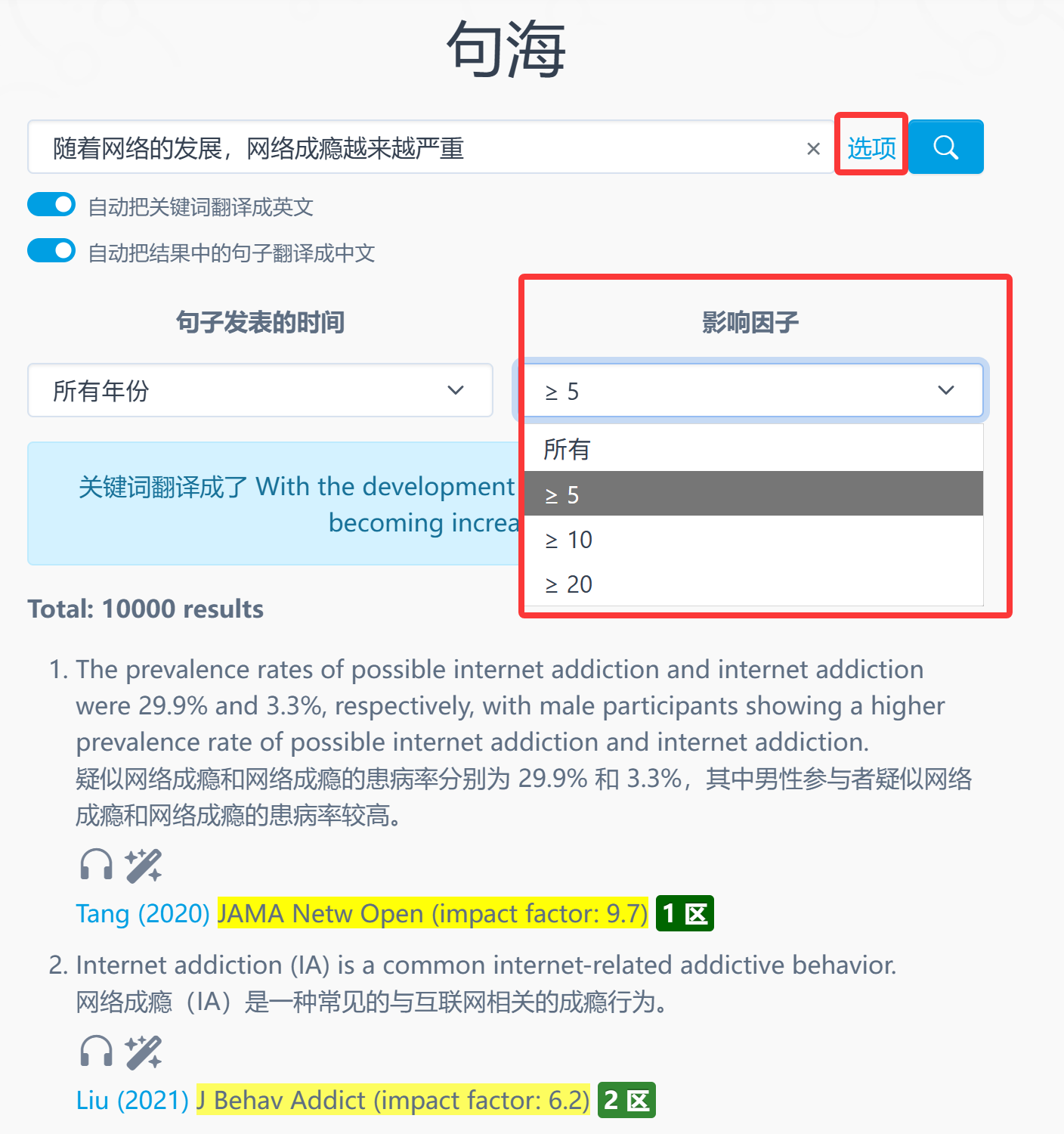 文献鸟句海高级功能更新,可以按句子出处文章的期刊影响因子筛选结果。